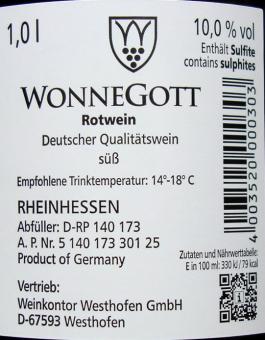 "Wonne Gott" Rotwein, süß, Deutscher Qualitätswein 1,0 Ltrfla.